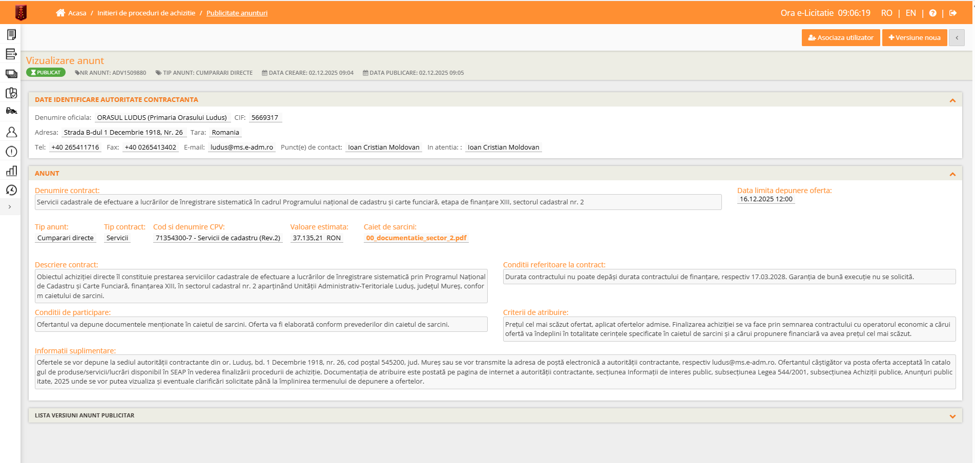 Anunț privind achiziția publică de servicii cadastrale de efectuare a lucrărilor de înregistrare sistematică în cadrul Programului Național de Cadastru și Carte Funciară, etapa de finanțare XIII, sectorul cadastral nr. 2