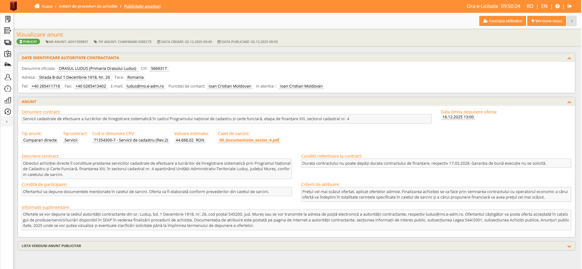 Anunț privind achiziția publică de servicii cadastrale de efectuare a lucrărilor de înregistrare sistematică